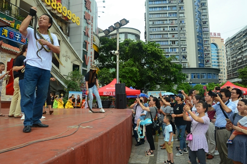“咚咚咚、咚咚咚”由南平戰勝鼓藝術團帶來的戰勝鼓表演《凱旋》拉開了表演序幕,鼓聲渾厚雄壯,粗獷有力,氣勢磅礴,頗具戰斗氣勢,立刻吸引了許多觀眾駐足觀看。隨后金線木偶表演《薛丁香審二路元帥》、畬歌演唱《畬歌唱響十九大》、大腔戲坐唱《彭祖討壽》等優秀的非遺表演極具延平民俗特色,樟湖的蛇藝表演更是將整場活動的氣氛推向高潮,大家紛紛拿起手機相機,走進臺前拍照,與蟒蛇來個“親密接觸”。
