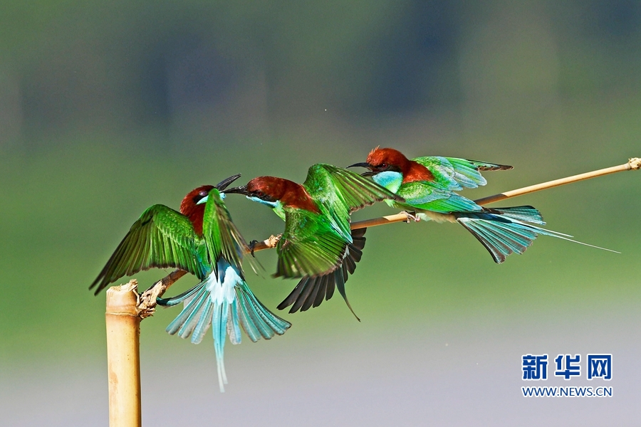 6月11日,福建省南平市延平區爐下鎮斜溪村,兩只藍喉蜂虎在“打架”。新華社記者 梅永存 攝