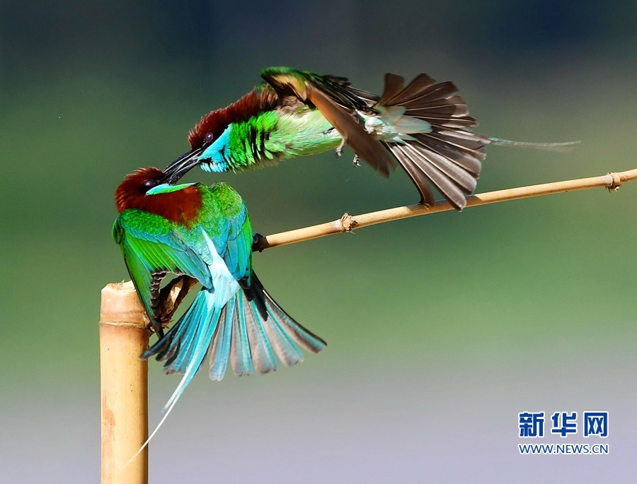 6月11日,兩只藍喉蜂虎在“打架”,其中一只明顯占據了上風。新華社記者 梅永存 攝