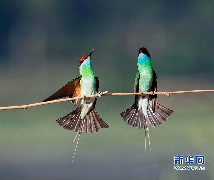 6月11日,福建省南平市延平區爐下鎮斜溪村,兩只藍喉蜂虎在枯枝上休憩。新華社記者 梅永存 攝