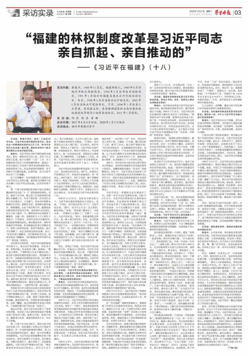采訪對象:黃建興,1948年11月生,福建閩侯人。1989年8月任福州市林業局副局長,1990年5月任市政府副秘書長,1991年1月起歷任福建省委辦公廳行政處副處長、處長,1998年4月任省委辦公廳副主任,2002年5月任省林業廳黨組書記、廳長,2008年1月任省人大常委、農經委主任,其間借調國家林業局任集體林權制度改革領導小組常務副組長。2011年1月退休。 采訪組:邱然 陳思 黃珊 采訪日期:2017年6月4日初訪,2020年1月5日核訪 采訪地點:福州市黃建興家中 采訪組:黃建興同志,您好!上世紀90年代初,習近平同志調任福州市委書記,您也在這一時期調到市政府辦公廳工作,90年代末你們又在省委一起共事。請您談談你們一起共事的情況以及您對他的印象。 黃建興:習近平同志1990年調任福州市委書記。那時,福州市有五區八縣,農村工作占到很大比重。他十分重視“三農”工作,為了加強市里對農村工作的協調和推動,提出讓一位農村基層工作過的干部任市政府副秘書長,協助市領導工作。經過市委組織部推薦,我于1990年5月就任此職。從那時起,我與習近平同志有了工作接觸。 在工作接觸中,我深刻感受到人民群眾在習近平同志心中的分量,感受到為民情懷已經深深融入習近平同志的血脈。這里列舉兩個例子。 第一個例子是妥善處理1990年連江縣琯頭鎮官岐村發生的“8·2”惡性群體性事件。當時,福州久旱不雨,鎮上派工作組到官岐村協調分水灌溉工作,有名干部發現一位農民私自擴大農田進水口,大發脾氣,爭執當中把群眾推倒在水田里。事情發生后,圍觀群眾越來越多,群情激憤。這名干部見勢不妙,跑離現場向鎮黨委負責同志匯報,說官岐村農民造反,應馬上派人教訓一下。鎮領導沒有認真細致了解情況,頭腦一熱,當即組織幾十個人把村子圍起來,打罵群眾,沖到村民家中打砸家具,造成的影響極其惡劣。琯頭鎮是僑鄉,海外華僑遍布世界各地,僑民知道這件事之后都很生氣,組織人到市里反映,要求嚴肅查辦。他們手頭掌握了一份記錄現場過程的錄像,表示:“如果市里不能解決,我們就到省里去告。如果省里還不能解決,我們就通過僑界告到中央去!”事態進一步惡化。 這件事發生的時候,習近平同志剛到福州市任職不久。他對這件事很重視,但處變不驚、非常沉穩。經過初步了解,他指出:“群眾是占理的,干部野蠻行為是不能容忍的。”他當機立斷組織調查組進行核實,然后做好安撫工作,再根據實際情況研究處理。這個調查組由公檢法等部門的十多位同志組成,讓我帶隊。臨走前,習近平同志特別叮嚀我下去之后不要搞官官相護,要多聽群眾意見,實事求是依法辦事。經過一個月認真細致地工作,調查組穩住了局面,掌握了真實情況,回來后向習近平同志主持的市委書記辦公會作了匯報。他聽取匯報并看了相關錄像,嚴肅指出:“這件事情處理的宗旨,就是為民伸張正義。對欺壓百姓的官員,一定要嚴懲不貸,絕不姑息。” 市委秘書長林文斌同志向連江縣委縣政府傳達了習近平同志的重要指示。縣里及時處理了毆打侮辱群眾的干部,并安撫了受害者。由于事情處理得公正、合理,得到了官岐村群眾的諒解。調查組離開時,村里的老百姓夾道歡送,還放了鞭炮,連江縣的海外鄉親也口耳相傳,大家都稱道習近平同志是“包青天”。 通過這件事,我對習近平同志留下了非常好的印象,也印證了我之前聽到的他在寧德地區留下的良好口碑。他那么年輕,卻敢于擔當,能夠秉公處事,替老百姓伸張正義,實在令人欽佩。 第二個例子發生在1998年,那時習近平同志在省委工作,我也調到了省委辦公廳直接為他服務。有一次我陪他到福清市調研,晚上8點多返回福州市區途中,遇見一起卡車和摩托車相撞事故。習近平同志看到騎摩托車男子倒在血泊中,要求立即停車下去看看。我們都勸他,交警已經到位了,就不用管了,還是繼續趕路吧。習近平同志嚴肅地對我們說:“倒在那里的如果是你們的親人,你們會不會下去。”他下車察看后,馬上叫人撥打120,接著俯下身握住傷者的手安慰他:“不要怕,我們周圍有這么多人幫忙呢。”10分鐘后,救護車趕到,等傷員上了救護車,習近平同志反復叮囑一定要搶救過來,然后才回到車上。在返城的車上,他一句話也沒有說,看得出來心情很沉重。車上靜悄悄的,大家都陷入了沉思。我想,習近平同志之所以堅持下車去看望傷者,是因為他確實把群眾當作了親人,十指連著心。 習近平同志還真誠愛護著身邊每一位工作人員,我對此也深有體會。1987年,省委辦公廳要調我去工作,但是因為家庭原因,我一直沒去。1988年夏天,我忙于抗洪,疏于照顧家中孩子,耽誤了醫治時間,17歲的兒子在生病17天后突然離世。這個令人無法接受的現實,給我造成了非常沉重的打擊。那段時間,我的精神幾近恍惚。1990年下半年,省委辦公廳又動議調我去,這次是通過習近平同志做我的工作。 1990年12月26日,是我至今難忘的日子,習近平同志請我到他的辦公室談心。我說:“習書記,我不想去省里工作了。”習近平同志說:“建興,你為什么不去?怎么想的,跟我說說。”我說:“我連孩子都沒有了,對我來說,一切都沒什么意思了。”沉默了一小會兒,習近平同志說:“建興,你所遇到的這種打擊,是一般人難以承受的。但是,過去的事情誰也無法改變了。你作為一個男子漢,千萬不要消沉下去,一定要振作起來。你調到省里面,工作