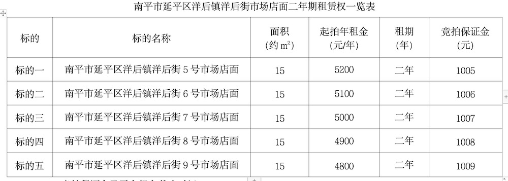 受委托,定于2024年07月16日上午9:00,通過延平區陽光平臺(http://ypygpt.zgpm.com/)舉行公開網絡競拍: 一、競拍標的:南平市延平區洋后鎮洋后街市場店面二年期租賃權具體標的詳情如下: 二、競拍保證金及平臺報名截止時間 競拍保證金截止時間:具體競拍保證金詳見以上表格,即日起至2024年07月15日下午5時前; 平臺報名截止時間:即日起至2024年07月16日上午8:30前。 報名時憑競拍保證金繳存憑據確認競租人資格。具體辦理報名、看樣、繳納競拍保證金等相關手續,請有意競租人與我中心聯系。 競拍保證金匯入以下指定賬戶: 戶名:南平市延平區公共資源交易中心; 賬號:9558831406000014201; 開戶行:工行延平支行。 三、本次競拍標的物優先承租權:無。 四、展示地點:標的物所在地。 五、聯系地址及詳情咨詢電話: 中心地址:南平市延平區八一路439號南平市延平區政務服務中心4樓。 中心聯系人:0599-8801022小邱。 看房聯系人:0599-8436601謝丹虹。 六、有關競拍的其他事項及規定詳見《競拍規則》。 微信公眾號:延平區政務服務中心。 發布競拍公告及規則的媒介:南平市公共資源交易中心延平區分中心(http://ggzy.np.gov.cn/yp)、延平區陽光平臺(http://ypygpt.zgpm.com/)、中國拍賣行業協會網站、延平區人民政府網(http://www.ypzf.gov.cn/)、延平新聞網。