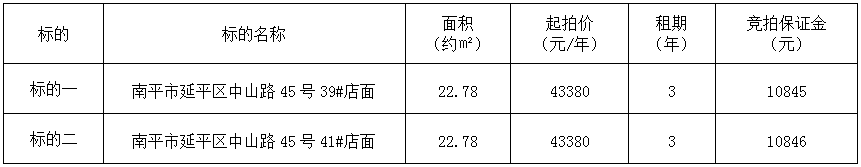 受委托,定于2024年11月26日上午9:00,通過延平區陽光平臺(http://ypygpt.zgpm.com/)舉行公開網絡競拍: 一、競拍標的:南平市延平區中山路45號店面三年期租賃權,具體標的詳情如下: 南平市延平區中山路45號店面三年期租賃權一覽表 標的一南平市延平區中山路45號39#店面22.7843380310845 標的二南平市延平區中山路45號41#店面22.7843380310846 二、競拍保證金及平臺報名截止時間: 競拍保證金截止時間:具體競拍保證金詳見以上表格,即日起至2024年11月25日下午5時前; 平臺報名截止時間:即日起至開拍前半小時。 報名時憑競拍保證金繳存憑據確認競租人資格。具體辦理報名、看樣、繳納競拍保證金等相關手續,請有意競租人與我中心聯系。 競拍保證金匯入以下指定賬戶: 戶名:南平市延平區公共資源交易中心; 賬號:9558831406000015950; 開戶行:中國工商銀行股份有限公司南平延平支行。 三、本次競拍標的物優先承租權:無。 四、展示地點:標的物所在地;展示時間:2024年11月15日起。 五、聯系地址及詳情咨詢電話: 中心地址:南平市延平區公共資源交易中心(南平市延平區八一路439號南平市延平區政務服務中心4樓)。 中心聯系人:0599-8801022小張。 看房聯系人:13860089267魏先生。 六、有關競拍的其他事項及規定詳見《競拍規則》。 微信公眾號:延平區政務服務中心。 發布競拍公告及規則的媒介:南平市公共資源交易中心延平區分中心(https://ggzy.np.gov.cn:9095/yp/)、延平區陽光平臺(http://ypygpt.zgpm.com/)、中國拍賣行業協會網站、延平區人民政府網(http://www.ypzf.gov.cn/)、延平新聞網。 南平市延平區公共資源交易中心 中拍平臺網絡科技股份有限公司 2024年11月15日 |