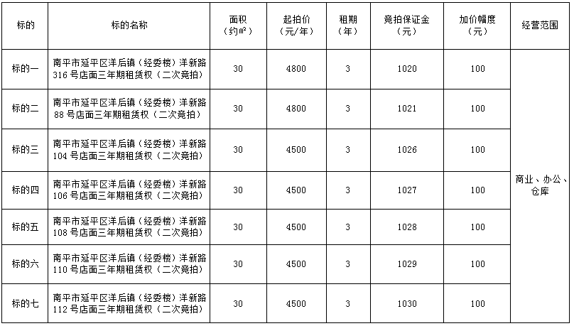 受委托,定于2025年3月25日上午9:00,通過延平區(qū)陽光平臺(http://ypygpt.zgpm.com/)舉行公開網(wǎng)絡(luò)競拍: 一、競拍標的:南平市延平區(qū)洋后鎮(zhèn)(經(jīng)委樓)洋新路店面三年期租賃權(quán)(二次競拍),具體標的詳情如下: 南平市延平區(qū)洋后鎮(zhèn)(經(jīng)委樓)洋新路店面三年期租賃權(quán)(二次競拍)一覽表 二、競拍保證金及平臺報名截止時間 競拍保證金截止時間:具體競拍保證金詳見以上表格,即日起至2025年3月24日下午5時前; 平臺報名截止時間:即日起至標的開拍前半小時。 報名時憑競拍保證金繳存憑據(jù)確認競租人資格。具體辦理報名、看樣、繳納競拍保證金等相關(guān)手續(xù),請有意競租人與我中心聯(lián)系。 競拍保證金匯入以下指定賬戶: 戶名:南平市延平區(qū)公共資源交易中心; 賬號:9558831406000015950; 開戶行:中國工商銀行股份有限公司南平延平支行。 三、本次競拍標的物優(yōu)先承租權(quán):有 四、展示地點:標的物所在地;展示時間:2025年3月17日起。 五、聯(lián)系地址及詳情咨詢電話: 中心地址:南平市延平區(qū)公共資源交易中心(南平市延平區(qū)八一路439號南平市延平區(qū)政務(wù)服務(wù)中心4樓)。 中心聯(lián)系人:0599-8801022小邱。 看房聯(lián)系人:0599-8436601謝女士。 六、有關(guān)競拍的其他事項及規(guī)定詳見《競拍規(guī)則》。 微信公眾號:延平區(qū)政務(wù)服務(wù)中心。 發(fā)布競拍公告及規(guī)則的媒介:南平市公共資源交易中心延平區(qū)分中心(https://ggzy.np.gov.cn/yp/)、延平區(qū)陽光平臺(http://ypygpt.zgpm.com/)、中國拍賣行業(yè)協(xié)會網(wǎng)站、延平區(qū)人民政府網(wǎng)(http://www.ypzf.gov.cn/)、延平新聞網(wǎng)。 南平市延平區(qū)公共資源交易中心 中拍平臺網(wǎng)絡(luò)科技股份有限公司 2025年3月17日 |
