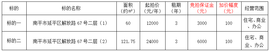 受委托,定于2025年4月15日上午9:00,通過延平區陽光平臺(http://ypygpt.zgpm.com/)舉行公開網絡競拍: 一、競拍標的:南平市延平區解放路67號二層(房屋)三年期租賃權,具體標的詳情如下: 南平市延平區解放路67號二層(房屋)三年期租賃權一覽表 二、競拍保證金及平臺報名截止時間 競拍保證金截止時間:具體競拍保證金詳見以上表格,即日起至2025年4月14日下午5時前; 平臺報名截止時間:即日起至標的開拍前半小時。 報名時憑競拍保證金繳存憑據確認競租人資格。具體辦理報名、看樣、繳納競拍保證金等相關手續,請有意競租人與我中心聯系。 競拍保證金匯入以下指定賬戶: 戶名:南平市延平區公共資源交易中心; 賬號:9558831406000015950; 開戶行:中國工商銀行股份有限公司南平延平支行。 三、本次競拍標的物優先承租權:無。 四、展示地點:標的物所在地;展示時間:2025年4月7日起。 五、聯系地址及詳情咨詢電話: 中心地址:南平市延平區公共資源交易中心(南平市延平區八一路439號南平市延平區政務服務中心4樓)。 中心聯系人:0599-8801022小邱。 看房聯系人:13706902354林女士。 六、有關競拍的其他事項及規定詳見《競拍規則》。 微信公眾號:延平區政務服務中心。 發布競拍公告及規則的媒介:南平市公共資源交易中心延平區分中心(https://ggzy.np.gov.cn/yp/)、延平區陽光平臺(http://ypygpt.zgpm.com/)、中國拍賣行業協會網站、延平區人民政府網(http://www.ypzf.gov.cn/)、延平新聞網。 南平市延平區公共資源交易中心 中拍平臺網絡科技股份有限公司 2025年4月7日 |