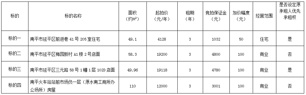 受委托,定于2025年7月31日上午9:00,通過延平區陽光平臺(http://ypygpt.zgpm.com/)舉行公開網絡競拍: 一、競拍標的:南平市延平區前進巷、梅園新村、三元路、火車站房屋(店面),具體標的詳情如下: 南平市延平區前進巷、梅園新村、三元路、火車站房屋(店面)三年期租賃權一覽表 二、競拍保證金及平臺報名截止時間: 競拍保證金截止時間:具體競拍保證金詳見以上表格,即日起至2025年7月30日下午5時前; 平臺報名截止時間:即日起至開拍前半小時。 報名時憑競拍保證金繳存憑據確認競租人資格。具體辦理報名、看樣、繳納競拍保證金等相關手續,請有意競租人與我中心聯系。 競拍保證金匯入以下指定賬戶: 戶名:南平市延平區公共資源交易中心; 賬號:9558831406000015950; 開戶行:中國工商銀行股份有限公司南平延平支行。 三、本次競拍標的物優先承租權:具體詳見以上表格。 四、展示地點:標的物所在地;展示時間:2025年7月23日起。 五、聯系地址及詳情咨詢電話: 中心地址:南平市延平區公共資源交易中心(南平市延平區八一路439號南平市延平區政務服務中心4樓)。 中心聯系人:0599-8801022小張。 看房聯系人:13860089267魏先生。 六、有關競拍的其他事項及規定詳見《競拍規則》。 微信公眾號:延平區政務服務中心。 發布競拍公告及規則的媒介:南平市公共資源交易中心延平區分中心(https://ggzy.np.gov.cn/yp/)、延平區陽光平臺(http://ypygpt.zgpm.com/)、中國拍賣行業協會網站、延平區人民政府網(http://www.ypzf.gov.cn/)、延平新聞網。 南平市延平區公共資源交易中心 中拍平臺網絡科技股份有限公司 2025年7月23日 |