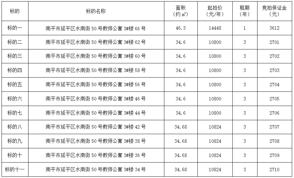 受委托,定于2025年8月19日上午9:00,通過延平區陽光平臺(http://ypygpt.zgpm.com/)舉行公開網絡競拍: 一、競拍標的:南平市延平區水南街50號教師公寓3#樓房屋租賃權,具體標的詳情如下: 南平市延平區水南街50號教師公寓3#樓房屋租賃權一覽表 二、競拍保證金及平臺報名截止時間: 競拍保證金截止時間:具體競拍保證金詳見以上表格,即日起至2025年8月18日下午5:00前; 平臺報名截止時間:即日起至標的開拍前半小時。 報名時憑競拍保證金繳存憑據確認競租人資格。具體辦理報名、看樣、繳納競拍保證金等相關手續,請有意競租人與我中心聯系。 競拍保證金匯入以下指定賬戶: 戶名:南平市延平區公共資源交易中心; 賬號:9558831406000015950; 開戶行:中國工商銀行股份有限公司南平延平支行。 三、本次競拍標的物優先承租權:無原承租人。 四、展示地點:標的物所在地;展示時間:2025年8月11日起。 五、聯系地址及詳情咨詢電話: 中心地址:南平市延平區公共資源交易中心(南平市延平區八一路439號南平市延平區政務服務中心4樓)。 中心聯系人:0599-8801022小張。 看房聯系人:18960668277王先生。 六、有關競拍的其他事項及規定詳見《競拍規則》。 微信公眾號:延平區政務服務中心。 發布競拍公告及規則的媒介:南平市公共資源交易中心延平區分中心(https://ggzy.np.gov.cn/yp/)、延平區陽光平臺(http://ypygpt.zgpm.com/)、中國拍賣行業協會網站、延平區人民政府網(http://www.ypzf.gov.cn/)、延平新聞網。 南平市延平區公共資源交易中心 中拍平臺網絡科技股份有限公司 2025年8月11日 |