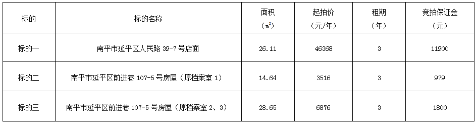 受委托,定于2025年8月20日上午9:00,通過延平區陽光平臺(http://ypygpt.zgpm.com/)舉行公開網絡競拍: 一、競拍標的:南平市延平區人民路、前進巷店面(房屋)三年期租賃權,具體標的詳情如下: 南平市延平區人民路、前進巷店面(房屋)三年期租賃權一覽表 二、競拍保證金及平臺報名截止時間 競拍保證金截止時間:具體競拍保證金詳見以上表格,即日起至2025年8月19日下午5時前; 平臺報名截止時間:即日起至標的開拍前半小時。 報名時憑競拍保證金繳存憑據確認競租人資格。具體辦理報名、看樣、繳納競拍保證金等相關手續,請有意競租人與我中心聯系。 競拍保證金匯入以下指定賬戶: 戶名:南平市延平區公共資源交易中心; 賬號:9558831406000015950; 開戶行:中國工商銀行股份有限公司南平延平支行。 三、本次競拍標的物優先承租權:標的一有原承租人。 四、展示地點:標的物所在地;展示時間:2025年8月12日起。 五、聯系地址及詳情咨詢電話: 中心地址:南平市延平區公共資源交易中心(南平市延平區八一路439號南平市延平區政務服務中心4樓)。 中心聯系人:0599-8801022小張。 看房聯系人:18850666877吳楊英。 六、有關競拍的其他事項及規定詳見《競拍規則》。 微信公眾號:延平區政務服務中心。 發布競拍公告及規則的媒介:南平市公共資源交易中心延平區分中心(https://ggzy.np.gov.cn/yp/)、延平區陽光平臺(http://ypygpt.zgpm.com/)、中國拍賣行業協會網站、延平區人民政府網(http://www.ypzf.gov.cn/)、延平新聞網。 南平市延平區公共資源交易中心 中拍平臺網絡科技股份有限公司 2025年8月12日 |