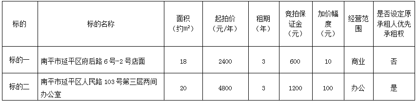 受委托,定于2025年9月2日上午9:00,通過延平區陽光平臺(http://ypygpt.zgpm.com/)舉行公開網絡競拍: 一、競拍標的:南平市延平區府后路、人民路辦公室(店面)三年期租賃權,具體標的詳情如下: 南平市延平區府后路、人民路辦公室(店面)三年期租賃權一覽表 二、競拍保證金及平臺報名截止時間: 競拍保證金截止時間:具體競拍保證金詳見以上表格,即日起至2025年9月1日下午5時前; 平臺報名截止時間:即日起至開拍前半小時。 報名時憑競拍保證金繳存憑據確認競租人資格。具體辦理報名、看樣、繳納競拍保證金等相關手續,請有意競租人與我中心聯系。 競拍保證金匯入以下指定賬戶: 戶名:南平市延平區公共資源交易中心; 賬號:9558831406000015950; 開戶行:中國工商銀行股份有限公司南平延平支行。 三、本次競拍標的物優先承租權:標的二有原承租人。 四、展示地點:標的物所在地;展示時間:2025年8月22日起。 五、聯系地址及詳情咨詢電話: 中心地址:南平市延平區公共資源交易中心(南平市延平區八一路439號南平市延平區政務服務中心4樓)。 中心聯系人:0599-8801022小張。 看房聯系人:13860089267魏先生。 六、有關競拍的其他事項及規定詳見《競拍規則》。 微信公眾號:延平區政務服務中心。 發布競拍公告及規則的媒介:南平市公共資源交易中心延平區分中心(https://ggzy.np.gov.cn/yp/)、延平區陽光平臺(http://ypygpt.zgpm.com/)、中國拍賣行業協會網站、延平區人民政府網(http://www.ypzf.gov.cn/)、延平新聞網。 南平市延平區公共資源交易中心 中拍平臺網絡科技股份有限公司 2025年8月22日 |