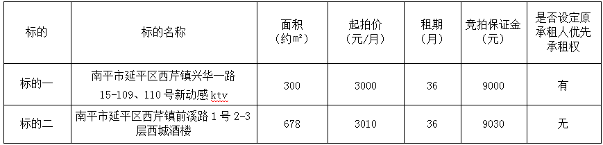 受委托,定于2025年9月3日上午9:00,通過延平區陽光平臺(http://ypygpt.zgpm.com/)舉行公開網絡競拍: 一、競拍標的:南平市延平區西芹鎮KTV、酒樓36個月租賃權,具體標的詳情如下: 南平市延平區西芹鎮KTV、酒樓36個月租賃權一覽表 二、競拍保證金及平臺報名截止時間 競拍保證金截止時間:具體競拍保證金詳見以上表格,即日起至2025年9月2日下午5時前; 平臺報名截止時間:即日起至標的開拍前半小時。 報名時憑競拍保證金繳存憑據確認競租人資格。具體辦理報名、看樣、繳納競拍保證金等相關手續,請有意競租人與我中心聯系。 競拍保證金匯入以下指定賬戶: 戶名:南平市延平區公共資源交易中心; 賬號:9558831406000015950; 開戶行:中國工商銀行股份有限公司南平延平支行。 三、本次競拍標的物優先承租權:標的一有原承租人。 四、展示地點:標的物所在地;展示時間:2025年8月26日起。 五、聯系地址及詳情咨詢電話: 中心地址:南平市延平區公共資源交易中心(南平市延平區八一路439號南平市延平區政務服務中心4樓)。 中心聯系人:0599-8801022小張。 看房聯系人:18650641528肖富佺。 六、有關競拍的其他事項及規定詳見《競拍規則》。 微信公眾號:延平區政務服務中心。 發布競拍公告及規則的媒介:南平市公共資源交易中心延平區分中心(https://ggzy.np.gov.cn/yp/)、延平區陽光平臺(http://ypygpt.zgpm.com/)、中國拍賣行業協會網站、延平區人民政府網(http://www.ypzf.gov.cn/)、延平新聞網。 南平市延平區公共資源交易中心 中拍平臺網絡科技股份有限公司 2025年8月26日 |